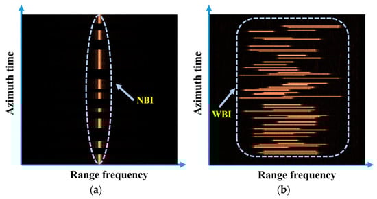 According to the relative bandwidth of the interference signal, RFI can be generally classified into narrowband interference (NBI) and wideband interference (WBI). The energy distribution of NBI in the frequency domain is relatively concentrated, while WBI accounts for a considerable portion of the useful target signal’s bandwidth, with its instantaneous frequency constantly changing with time. Figure 1 shows a range–frequency azimuth-time representation of SAR echo data contaminated with NBI and WBI, respectively. In Figure 1a, some isolated bright spots or vertical bright lines appear in the data polluted by NBI, which corresponds to the narrowband characteristics of NBI in each single pulse, possessing only a few frequency bins. In contrast, WBI appears as multiple horizontal lines in Figure 1b, indicating a significantly larger bandwidth occupied by the interference signal. From an overall perspective, NBI and WBI markedly differ in signal characteristics and, therefore, are often treated distinctively.