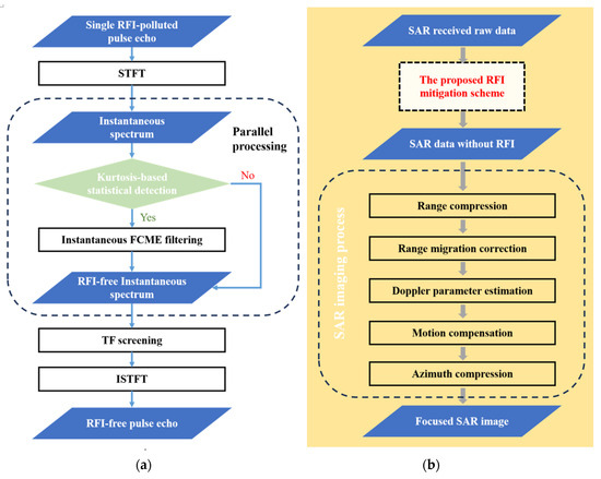 Flowchart of (a) the proposed RFI mitigation scheme and (b) incorporation with the SAR imaging process.