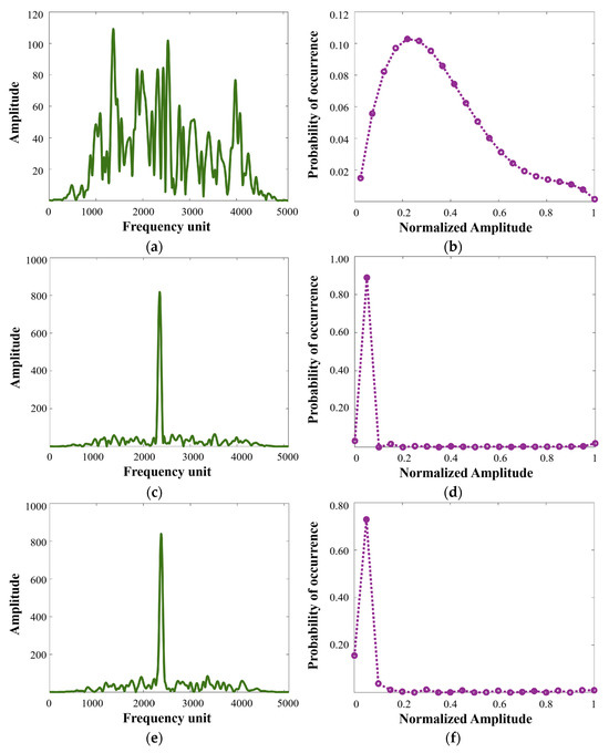In practice, not all instantaneous spectra contain interference components because of the time-varying characteristic of RFI. Consequently, in order to avoid useful signal loss and computing resource waste caused by excessive processing, it is necessary to first detect the instantaneous spectra polluted by RFI before taking interference suppression measures. Figure 4 displays typical instantaneous spectra with and without RFI and their corresponding approximate probability density functions. As shown in Figure 4a,b, since radar echo signal approximately follows complex Gaussian distribution and STFT is a linear transformation, the instantaneous spectra without interference still follow Gaussian-like distribution, with their amplitudes conforming to Rayleigh distribution. Nevertheless, as can be seen from Figure 4c–f, NBI and WBI introduce peaks to the instantaneous spectrum, endowing it with narrowband characteristics, which considerably increase the sharpness of the instantaneous spectrum. Accordingly, extreme values arise in the amplitude distribution, resulting in a tailing phenomenon in the right segment of the probability density function.