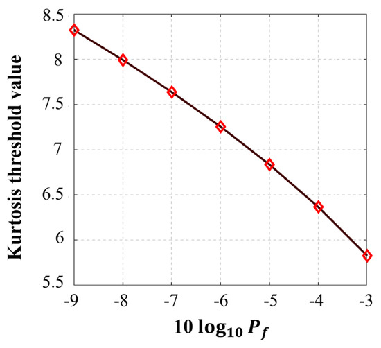 For the initial kurtosis-based statistical RFI detection, the data-dependent parameters and in Equation (8) are required to be estimated from the RFI-free pulses, which are 3.1254 and 0.9780, respectively. On this basis, the variation trend of the kurtosis threshold with respect to the false alarm level is illustrated in Figure 6, in which the kurtosis threshold witnesses a downward trend with the increase in . In this experiment, the false alarm level is empirically set as .