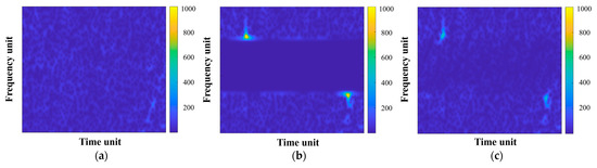An interference signal is usually highly coupled to useful target signals in the time or frequency domain; hence, one-dimensional analysis is not suitable for interference mitigation in many cases, especially in the interference scenario of WBI. TF analysis reflects the energy distribution of the signal into two dimensions and can explicitly display the instantaneous frequency variation in the input signal with time. As a representative realization of TF transform, STFT provides the time–local spectral information of the signal, making it suitable for the analysis of time-varying and non-stationary signal components. Suppose that the input signal is , given a certain sliding window with window length , the TF data acquired through STFT can be represented as:
