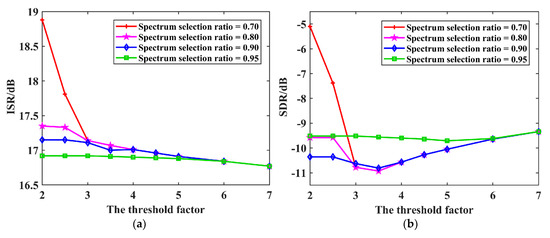 Variation curves of ISR and SDR versus the threshold factor under different spectrum selection ratio settings: (a) ISR; (b) SDR.