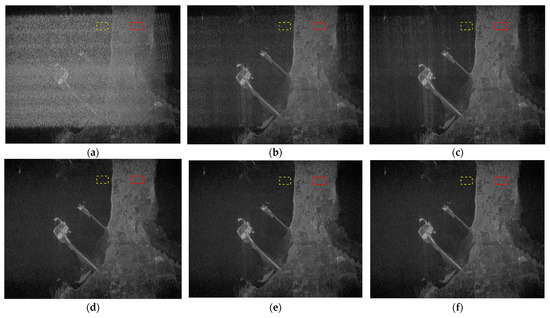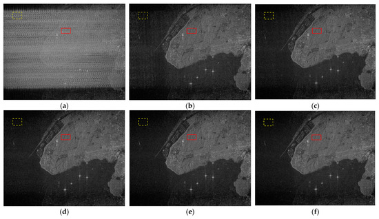 SAR imaging results before and after NBI mitigation: (a) the SAR image without NBI mitigation; (b–f) the SAR imaging results after processing via the range spectrum notch filtering method, the linear prediction extrapolation method, the TF mask method, the instantaneous spectrum notch filtering method, and the proposed method, respectively.