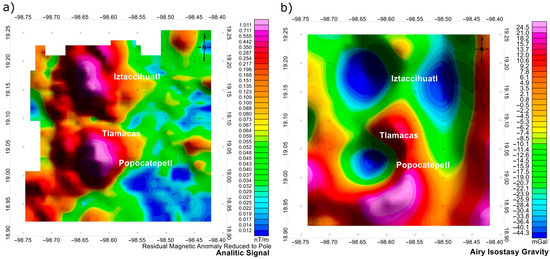 Geophysical anomalies: (a) analytic signal of reduced-to-pole residual magnetic field; (b) Airy isostatic gravity anomaly.