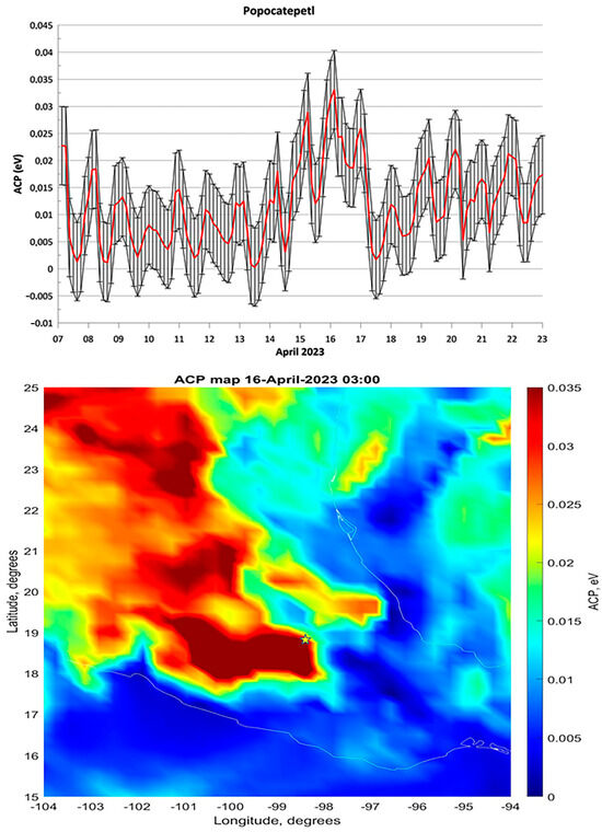 Top panel—ACP variations over the Popocatepetl volcano caldera around the time of volcano eruption in the middle of April 2023. Bottom panel—the spatial ACP distribution registered on 16 April 2023. The location of the Popocatepetl volcano is marked by the yellow star.