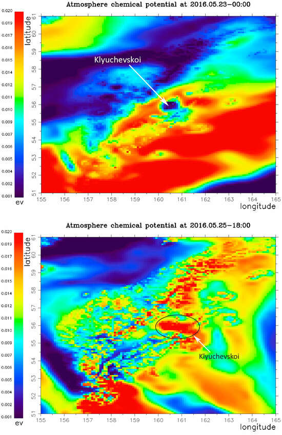 Top panel—Spatial distribution of ACP at Kamchatka peninsula on 23 May 2016, Bottom panel—spatial distribution of ACP at Kamchatka peninsula on 25 May 2016.