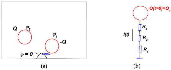 The geometry of the problem. Part (a) is the mountain area with two oppositely charged clouds Q, −Q. The mountain is marked by a black arrow. The region of air ionization is marked by a blue line. Part (b) is the equivalent circuit for discharging through the resistance series.