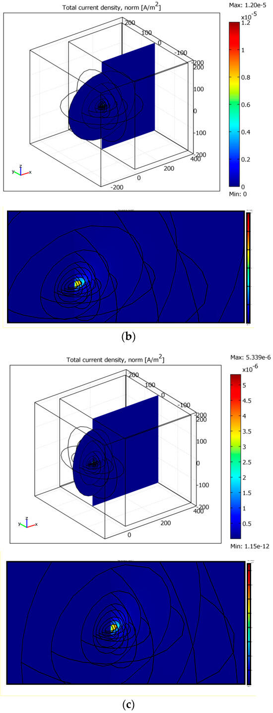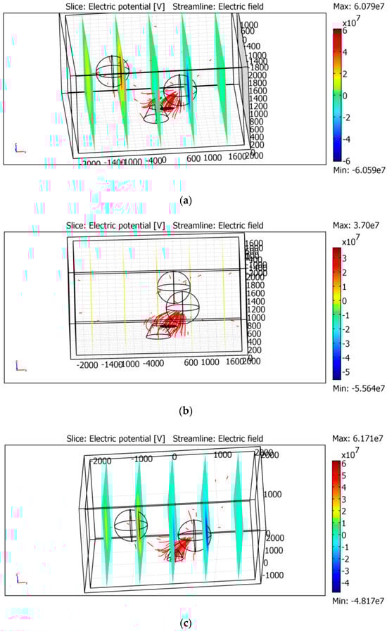 Simulations of DC problem. The concentration of the electric current at the corona region. The lines of the current are presented in red. Parts (a–c) correspond to different longitudinal sizes of the ionization regions.