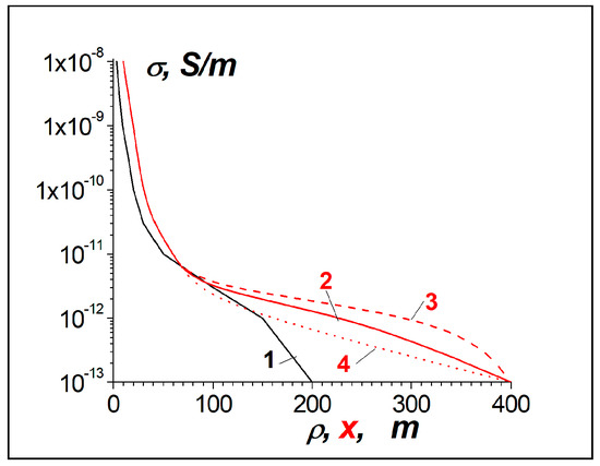 ρ (curve 1) and the longitudinal distance x (curves 2, 3, and 4). Curves 2, 3, and 4 correspond to