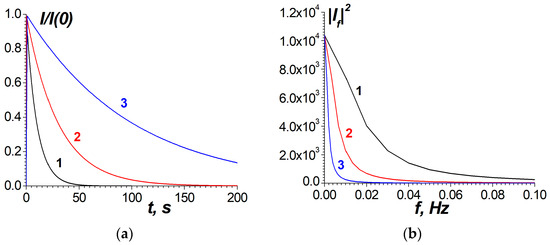 (a) I(t) and (b) the frequency spectra of I. The curves 1, 2, and 3 correspond to the discharge times τ = 10 s, 30 s, 100 s, respectively.