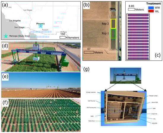 The study area shown in Figure 1a is the Maricopa Agricultural Center, Maricopa, Arizona, USA (33.070°N, 111.974°W, elevation 360 m). A close view of the study area in Figure 1b shows the location of the two replicate fields, while Figure 1c shows the position of the plots (well-watered and water-limited). The TERRA-REF field scanner (Figure 1d) is the LemnaTec-built field scanner, which is equipped with a camera box (Figure 1g) that houses the 3D laser, thermal infrared, stereo RGB cameras, a camera for chlorophyll fluorescence, and a hyperspectral imaging system.
