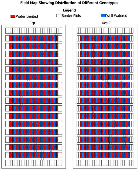 In this research, 12 wheat genotypes out of the 224 planted were selected in the experiment for our analysis, each planted in duplicate within the research field (2 replicates). The choice of these specific genotypes was informed in part by a prior study conducted in the same field, which assessed their water content and osmotic potential under simulated drought conditions []. To investigate the drought impact, water-deficit treatments were implemented by maintaining the eastern rows of the research plots under well-watered (WW) conditions while subjecting the western rows to water-limited (WL) conditions. In detail, two primary fields—Rep 2 to the north and Rep 1 to the south—were planted in a grid, comprising sixteen ranges and sixteen columns, which we referred to as ‘plots’. Within each plot, durum wheat was planted in two rows, each 3.5 m long with 0.76 m between rows. Both treatments received irrigation by subsurface dripline during plant establishment until 77 days after planting. At that time, the treatments were implemented such that the eastern row of each plot continued to receive irrigation, while the western row of each plot experienced a progressive water deficit as irrigation was terminated. Our observations were categorized into four phases relating to drought stress. Initially, during the ‘Pre-stress’ phase, all rows received irrigation to maintain well-watered conditions. Then, on March 6 (77 days after planting), the treatments were implemented, and the experiment transitioned into the ‘Early drought’ stage when irrigation to the western rows was restricted. As we approached the height of the water stress in the ‘Mid drought’ phase, the eastern row maintained its regular irrigation schedule. Finally, by April 3, the ‘Post Treatment’ phase began, with all watering ceased for both rows across all plots in preparation for biomass harvest. Figure 2 shows the field map of the study area. This field map shows the distribution of each genotype and the water treatment on individual plots.