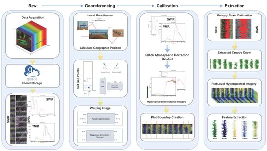 Outlined in Figure 3 is our structured approach to processing hyperspectral imagery. The workflow begins with the acquisition of raw images using hyperspectral sensors. Once we have these images, they undergo a series of methodical processing stages. First, we perform georeferencing to anchor each image within a precise spatial context. Next, we calibrate the images to convert digital numbers (DNs) into reflectance values—a crucial step for subsequent analyses. The images are then segmented to identify and isolate specific regions of interest. Finally, we extract significant features from the segmented images, aiming to capture the essential data for our research objectives. The following sections will provide an in-depth understanding of each of these stages, elucidating the methods and techniques we have employed.