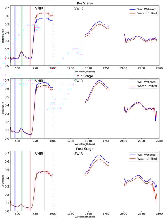 Mean vegetation spectra of plants from two different treatments in three stages: Pre-stress stage (28 February); Mid-stress stage (22–23 March); and Post-stress stage (7–8 April). The blue, green, red, and NIR regions are delineated with corresponding colors, and a dotted line distinguishes between the VNIR and SWIR ranges.