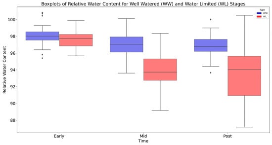 Leaf-level relative water content (RWC) was measured on fully expanded leaves sampled at dawn and transported to the laboratory for processing, as described by Condorelli et al. (2022) []. Figure 5 illustrates the boxplots of RWC for both well-watered (WW) and water-limited (WL) conditions during the three main stress stages: Early, Mid, and Post. These boxplots provide an overview of RWC values, indicating the median, range, and any outliers. A clear observation from Figure 5 is that RWC values for the WW conditions are consistently higher than those for the WL conditions at every stage. The difference is especially noticeable from the Mid drought stage, highlighting the intense water stress during this time.