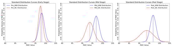 Multiple statistical tests were used to thoroughly assess the variations in plant water content. Data consistency across groups was ensured by preliminary tests like the O’Brien, Brown–Forsythe, Levene, and Bartlett [] tests, which laid the groundwork for further analyses; these results are summarized in Table 5. The overall differences in water content between the plant treatments were then determined using the F-test (ANOVA), which gave a thorough overview. The one-way ANOVA was used to delineate the data at each stage, which are summarized in Table 6 and provide a more detailed understanding of these disparities at study intervals. The pooled t-test directly compared the two treatments to conclude the analysis, providing a clear quantification of the differences in water content between them. Results for the pooled t-test for all stages are summarized in Table 7. This battery of tests ensured a comprehensive understanding of the study’s findings. Figure 6 shows the standard distribution of RWC for all development stages.
