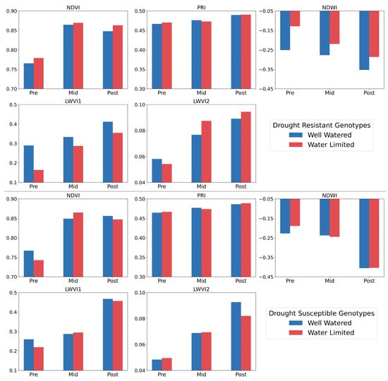 Derived from high-resolution hyperspectral images, indices such as NDVI, PRI, NDWI, LWVI1, and LWVI2 offer insights into plant physiological states under different water conditions. These indices serve as critical tools in assessing the performance of durum wheat genotypes under drought conditions []. Figure 7 vividly illustrates how drought-resistant and drought-prone genotypes responded to water stress, as measured by the given indices across the Pre-, Mid-, and Post-treatment stages.