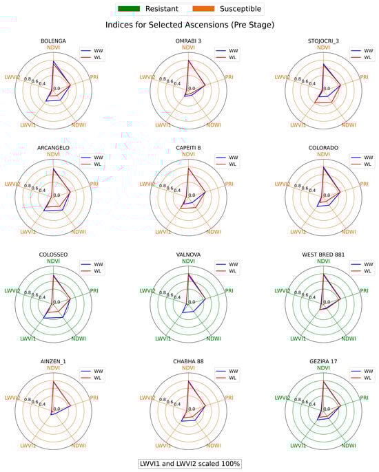 Radial chart of spectral indices for wheat genotypes at Pre stage.