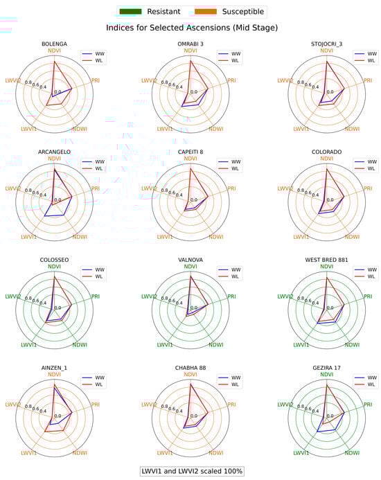 Radial chart of spectral indices for wheat genotypes at the Mid-stress stage.