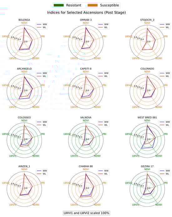 Radial chart of spectral indices for wheat genotypes at the Post-treatment stage.