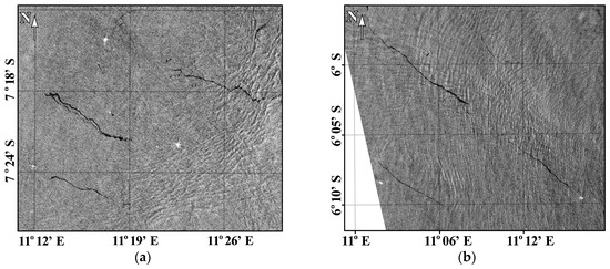 Extended slick bands in the areas of frequently appearing internal waves: Sentinel-1A, 27 September 2019, 04:52:36 UTC (a); Sentinel-1B, 8 January 2018, 17:33:15 UTC (b).