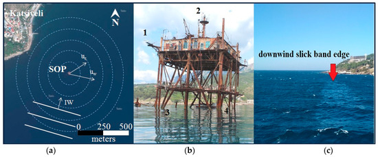 Scheme of the experiment on 23 May 2019 (a), view of the platform (b) and photograph of the initial stage of the slick band formation (c). 1—X-band coherent radar station, 2—ultrasonic anemometer and weather station, 3—ADCP and 4—surfactant source. The circles correspond to distances from the radar station (grazing angles): 100 m (80.8°), 200 m (85.4°), 300 m (87°), 400 m (87.7°), and 500 m (88.2°). uc, uw, and IW denote the direction of the sea current, wind, and IW front.