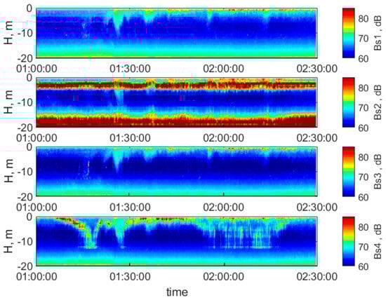 Acoustic backscattering for each of the four beams of ADCP during the experiment of 23 May 2019, 01:00–02:30 (UTC + 3). Beam 1—southward, beam 2—northward (under the platform), beam 3—westward, and beam 4—eastward.