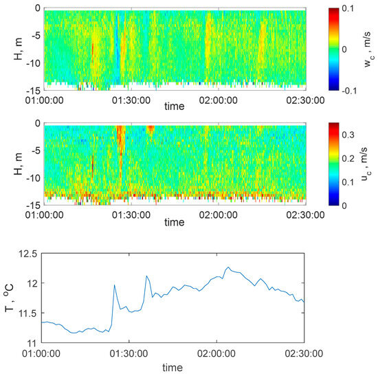 Figure 3 shows a leading train of three solitons of the highest intensity (t1 = 01:16, t2 = 01:26, and t3 = 01:36) and two retarding solitons of low amplitude (t4 = 01:56 and t5 = 02:14). Since the total depth H near the platform is about 25–30 m, under such conditions the IW predominantly sinks with an amplitude below the undisturbed pycnocline [18]. For sinking solitons, the enhancement of the current velocity in the direction of IW propagation is characteristic of the upper layer h1. The behavior of the vertical velocity component can be characterized by an alternating sign: on the front side of the soliton, the vertical velocity is negative, turning into positive on the back slope [19]. The described behavior is observed in a field experiment (Figure 4).