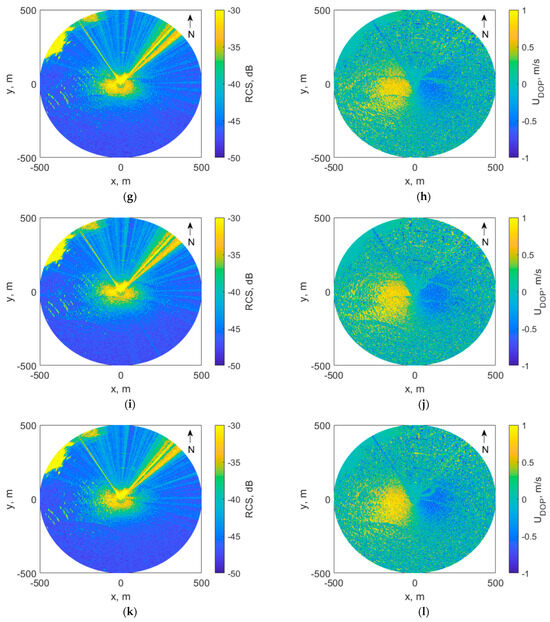 Radar image of the sea surface on May 23, 2019. RCS at 01:09 (a), 01:15 (c), 01:19 (e), 01:24 (g), 01:29 (i), and 01:33 (k); Doppler velocity at 01:09 (b), 01:15 (d), 01:19 (f), 01:24 (h), 01:29 (j), and 01:33 (l). The x axis is directed to the east and the y axis, to the north; (0,0) is the location of the radar and surfactant source.