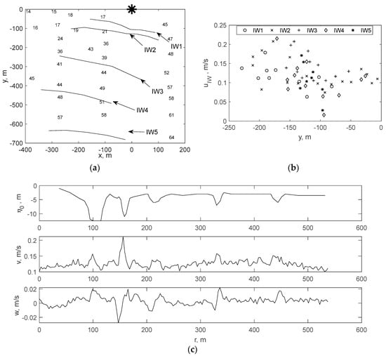 Spatial structure of the IW-related bands at 1:09 a.m. on 23 May 2019 (a); propagation velocities of individual solitons of the packet (b); amplitudes of the IW solitons, horizontal v and vertical w velocities in a layer of 0.5–12 m during the passage of the IW (c). The numbers show the depth values in meters. The asterisk shows the location of the radar on the platform.