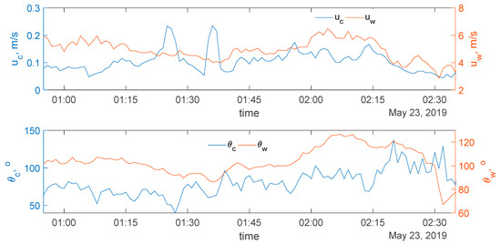 The kinematics of an extended artificial slick band (ASB) on the sea surface was first studied in [16]. The main factors affecting the width and azimuthal position of the band are current and near-surface wind. Figure 7 shows the speed and direction of the current (uc, ) at a depth of 1 m, as well as the speed and direction of the wind (uw, ) at a height of 24 m during the experiment. For ease of perception, the directions of the current and wind are given in a single coordinate system, so the westerly wind has a direction of about 90 degrees. Based on these data, the speed ud and direction of the surface current were calculated as the vector sum of the current speed and 3% of the wind speed at a standard meteorological height of 10 m [16].