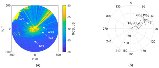 During the passage of the IW packet, strong short-term modulation of the ASB shape was observed in the radar panoramas, which manifested itself in a change in the direction and shape of ASB propagation (Figure 8). The proposed method for processing the results of ASB radar observations is shown in Figure 8b. Each radar image obtained in one revolution of the radar antenna (Figure 8a) provides information about the band boundaries, which can be determined using the maximum brightness gradient condition (Figure 8b). Next, for each vector the slick band fragment is characterized by , where Q is the local angle of the slick fragment in the polar coordinate system, and W is the local band width. Preliminary analysis showed that a spatial resolution of 1 m was sufficient to discern spatial variations of the ASB due to the IW. Previous studies have shown that the effects of surfactant spreading in the band appear on scales of about 100 m from the source [16]. However, in contrast to [16], in the presence of heterogeneous currents from the IW, the film concentration in the ASB cannot be considered constant [13]. According to [13], the inhomogeneity of the concentration depends on the length over which the IW acts on the film.