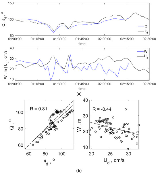 Comparison of the direction Q and width W of an artificial slick band with the direction , and speed ud of the surface current during the passage of the IW solitons (a). Results of the corresponding correlation analysis (b). R is the correlation coefficient. Solid lines correspond to the linear approximation and the dotted lines to Q = .