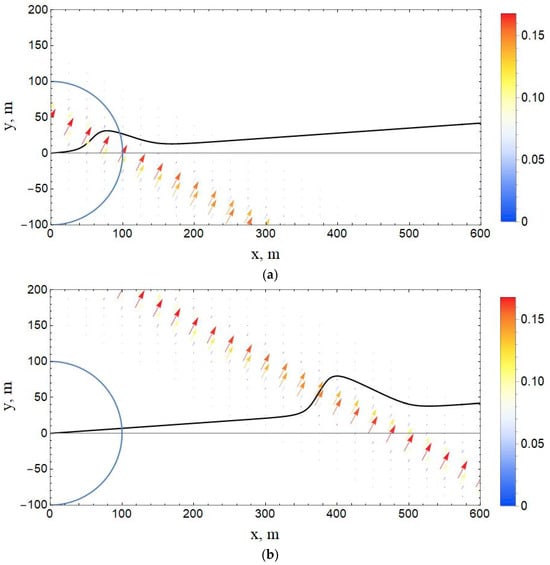 Dynamics of the slick-band shape during the passage of a current disturbance related to the internal wave soliton. Simulation parameters correspond to the experiment (see the text). (a) t = 1000 s; (b) t = 4800 s. The color bar describes the disturbance modulus of the current speed. A semicircle marks the 100 m area.
