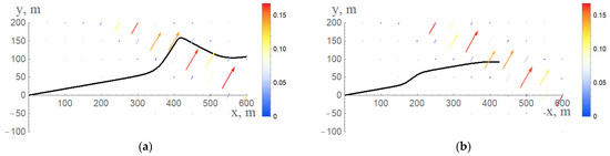 In this way, the situation realized in the field experiment was simulated. The calculation results presented in Figure 10a fully simulate IW2 shown in the radar panorama in Figure 8a. Numerical simulation permits one to consider the further spatiotemporal development of the band shape and to study the possible scenarios for the dynamics of the slick band. The soliton propagates with velocity at an angle to the background current Ubackgr and, accordingly, to the undisturbed direction of propagation of the slick band. However, it was clear that the situation could change depending on the relation between Ubackgr cos and . Therefore, simulations with different parameter ratios were performed, and new effects described in the discussion section were discovered.