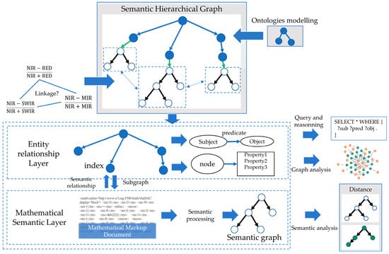 - A knowledge representation method is developed for remote sensing indices. It adopts a semantic hierarchical graph structure to represent the remote sensing index graph using two layers: The entity-relationship layer and the mathematical semantic layer. The former primarily models the related concepts and their relationships, while the latter represents and analyzes the mathematical semantics of the index formula.