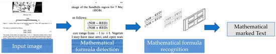 Because formula information for remote sensing indices is dispersed across various publications, it is appropriate to use automated methods for extracting formula objects. Given the different locations of formula information in papers, the process of mathematical formula extraction can be divided into two subtasks: Mathematical formula detection (MFD) and mathematical formula recognition (MFR). MFD is concerned with locating mathematical formulas using object detection or scene text detection, whereas MFR is concerned with converting formula images into text or markup language. Figure 4 shows the entire process to obtain mathematical formulas for indices.