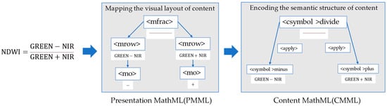 The MFR task is a specialized field aimed at automatically converting formula images into structured formula descriptions after locating them []. The MFR task is crucial for knowledge engineering and scientific document recognition. Deng et al. [] introduced large datasets such as IM2LATEX-100K, significantly advancing the development of formula image recognition models. In this study, a pre-trained MFR model based on datasets such as IM2LATEX-100K [] is employed for formula recognition in remote sensing index formulas, and the results are transformed into MathML (Mathematical Markup Language) documents using appropriate tools. The next section will introduce the representation and parsing of semantic equations with MathML.