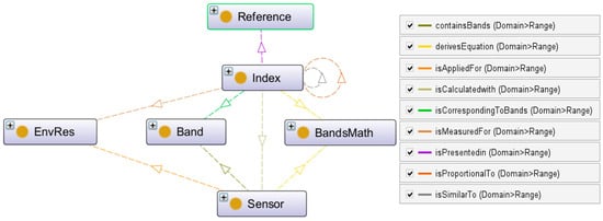 Table 5 does not include a complex triple: (Sensor and Index, derivesEquation, Bands): It specifies how to convert a general index formula into a specific calculation method (BandsMath). When calculating NDVI with a specific sensor, the specific bands of that sensor must be taken into account in order to obtain the final calculation formula. This is frequently a built-in function in platforms such as ArcGIS that can be directly calculated. Based on the triples listed above, ontologies are summarized (Figure 3).