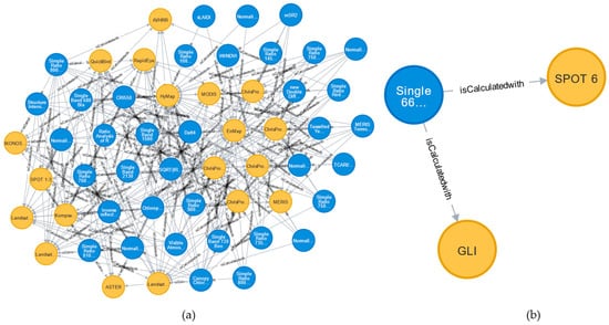 Currently, emerging technologies, such as artificial intelligence, can assist scientists in managing and obtaining new knowledge from massive amounts of data and literature more effectively []. Knowledge graphs (KG) [], a method for representing knowledge in terms of entities, attributes, and relationships, have gained increasing interest in recent years. In the field of remote sensing, KGs are primarily employed for extracting and organizing concepts from diverse and heterogeneous data sources [], integrating and managing data resources [], aiding tasks such as scene classification [], and semantic segmentation [] in remote sensing image interpretation []. By linking external heterogeneous information, KGs can also contribute to representation learning and ontology reasoning for crop identification [], disaster prediction [], oil spill detection [], etc. To the best of our knowledge, however, there is no published KG for remote sensing indices. Existing KGs are unsatisfactory because they are not designed to represent remote sensing indices, and they are incapable of analyzing and managing the relationships and mathematical semantics among indices.