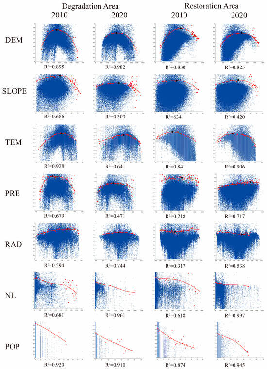| Factors | Whole Region | Degradation Area | Restoration Area | |||