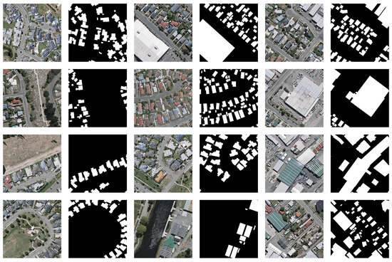 (1) WHU building dataset: The aerial imagery data originate from the New Zealand Land Information Service website; they were captured in Christchurch, New Zealand and cover an approximate area of 450 square kilometers. This dataset covers 187,000 buildings and has a spatial resolution of 0.3 m. It consists of 8189 images that are 512 × 512 in size. The dataset is divided into a training set (130,500 buildings, 4736 images), a validation set (14,500 buildings, 1036 images), and a test set (42,000 buildings, 2416 images). Furthermore, we computed that architectural pixels account for 15.4% of the dataset, while non-architectural pixels comprise 84.6% of the dataset. For subsequent experiments, the original dataset’s training–test split ratio was maintained. Some sample images from the dataset are shown in Figure 6.