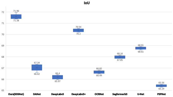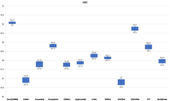 In order to highlight the superiority of our model objectively and to reduce the randomness of comparative experiments. We did a number of repeated experiments and plotted box plots in Figure 9. As can be seen from the figure, after many experiments, the model in this paper outperforms other models on IoU, including some current SOTA models such as DSTANet, SDSC-UNet, STT, and BuildFormer.