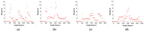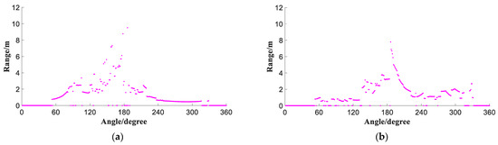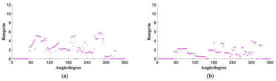 Figure 2a,b are the laser data of the 1st and 150th frames of Room 1, while Figure 3a,b are the corresponding laser data of Room 2. It is evident that the laser data between different frames in the same room are similar, while the difference in laser data between different rooms is significant. Therefore, after collecting sufficient laser data, the deep learning method is employed to extract different features for room classification.