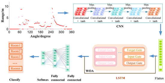 In this paper, a network integrating CNN and LSTM is proposed. CNN only captures spatial information and LSTM further extracts the implicit spatial–temporal features from the time series data. The algorithm flowchart is shown in Figure 4. Firstly, features of the laser data of different rooms are extracted by CNN. Then, multiple features extracted by CNN are flattened and fed into the LSTM network. Finally, the full connection and softmax are used for room recognition.