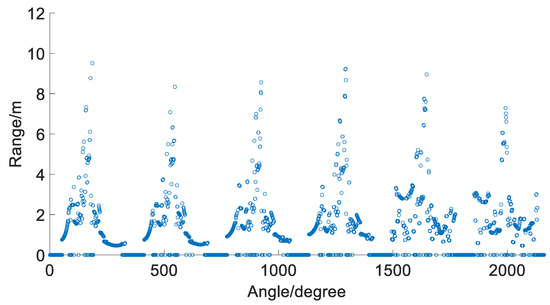 A single frame of laser data depends on the minimum angle resolution of LiDAR. The angular resolution of the Slamtec rplidar A2 LiDAR employed is 0.225 degrees. The minimum size of the obstacle is proportional to the distance from the obstacle. For instance, considering a distance of 5 m to the obstacle, the minimum detectable size of the obstacle is 1.96 cm. To reduce the amount of calculation, data compression is performed. Direct data association exists between the front and back frames of the laser. Several frames of data in Room 4 are extracted for interception and splicing, as depicted in Figure 5. It is evident that there are variations in the laser distributions collected by robots in different locations. Their features can be extracted by CNN.