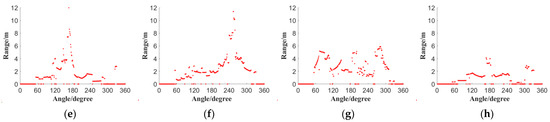 The 80th frames of the 2D LiDAR data: (a) Room 1; (b) Room 2; (c) Room 3; (d) Room 4; (e) Room 5; (f) Room 6; (g) Room 7; (h) Room 8.