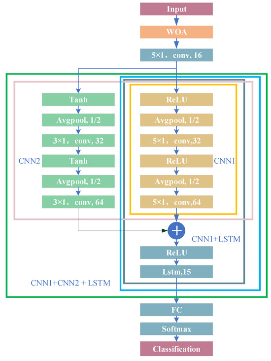 Using the WOA algorithm to train the initial learning rate, the regularization parameters and the number of LSTMs enable autonomous parameter learning, resulting in an enhanced classification accuracy.