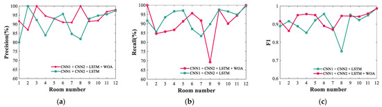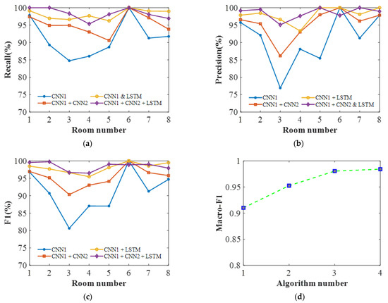 As shown in Figure 12a,b, the recall, accuracy and precision of the model increase as the network incorporates more modules. In order to comprehensively evaluate the precision and recall, an F1 curve was used. As shown in Figure 12c, the F1 curve also demonstrates a similar synergistic effect of multiple modules, where the network CNN1 + CNN2 + LSTM exhibits evident advantages. The minimum value of F1 is 0.9647 and the maximum is 0.9975, which proves the effectiveness of the network in accurately identifying rooms. As shown in Table 1 and Figure 12d, the Macro-F1 is also benefited by the combined synergy of the three modules.