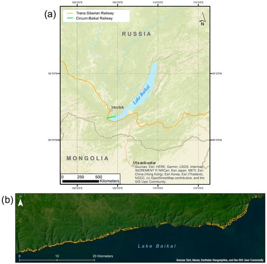 The study site is located on the territory of the Irkutsk region in Russia (Figure 1a). The Circum-Baikal Railway is a part of the Trans-Siberian Railway. It is located in a mountainous area, bordered by steep rocks on one side and limited by the shore of Lake Baikal on the other. Vehicle access is partially possible; there is no access by any other transport except for the rail, which runs back and forth once a day.